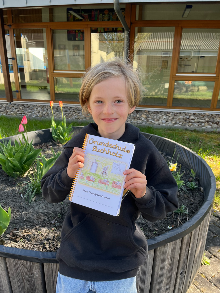 Zu Beginn des Jahres 2025 wurde ein Malwettbewerb für die Schülerinnen und Schüler der Grundschule Buchholz veranstaltet. Zum Thema "Schule der Zukunft" sollten sie ein Bild gestalten. Unter allen eingereichten Bildern sollte eins ausgewählt werden, das im nächsten Schuljahr den Einband des neuen Hausaufgabenhefts schmücken soll. Die Kinder wurden sehr kreativ und gestalteten zahlreiche ideenreiche und künstlerisch beeindruckend umgesetzte Bilder. Nach einigen Wochen des sehnsüchtigen Wartens war es am Freitag, dem 4. April 2025, endlich so weit. Die ganze Schulfamilie traf sich im Atrium, um das Geheimnis um den Gewinner des Malwettbewerbs zu lüften. Schließlich wurde das Gewinnerbild des fantasiereichen und künstlerischen Kopfes Jonathan auf einem Exemplar des Hausaufgabenhefts präsentiert. Dafür durfte eine Belohnung in Form einer Ausgabe des Hausaufgabenhefts sowie eines kleinen Geschenks nicht fehlen.